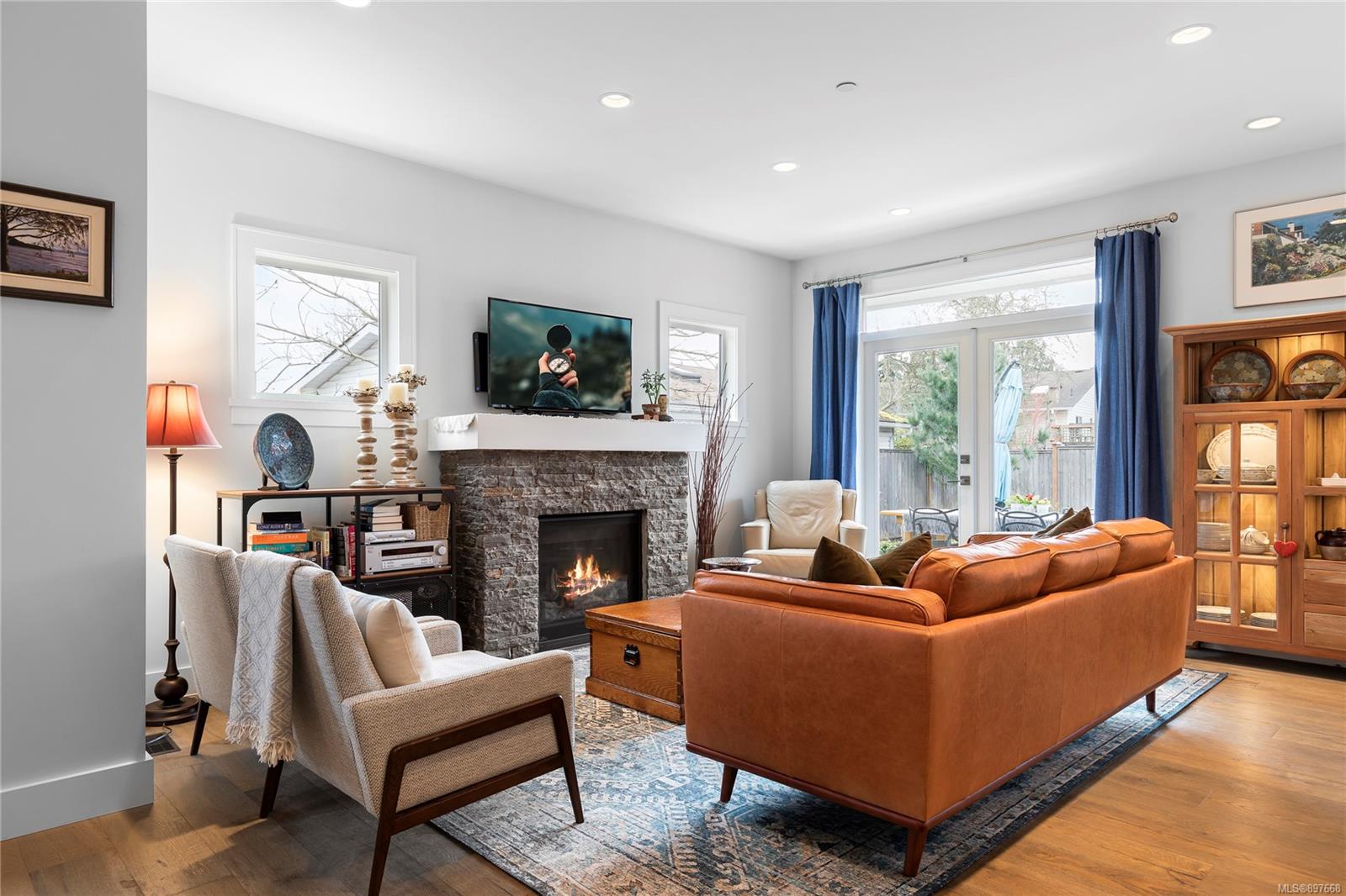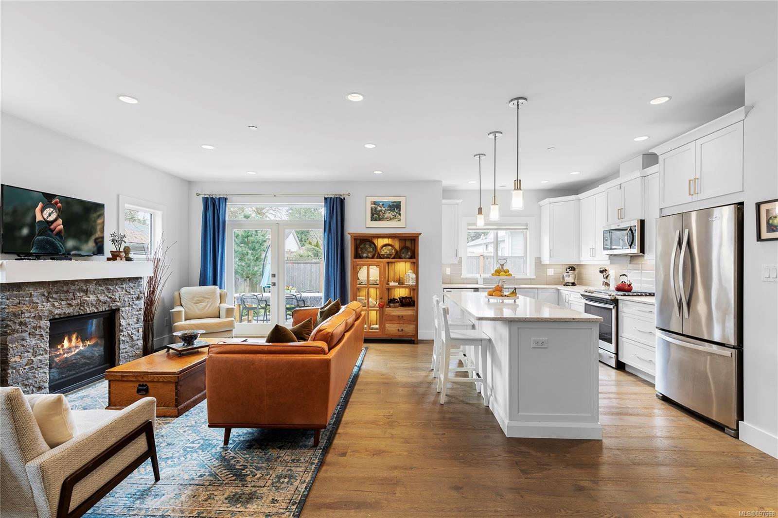 In the living room, enjoy the cozy stacked-stone fireplace and French doors that give you access to the fenced-in backyard, with a patio [BBQ hookup] plus a landscaped & irrigated lawn.