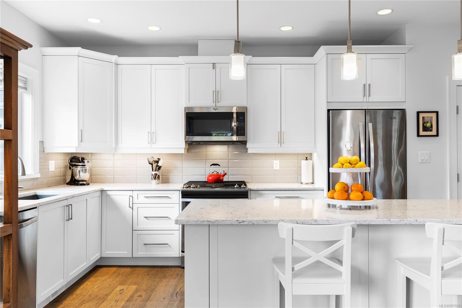 The modern open-concept floor plan showcases your beautiful kitchen, which features custom cabinetry, quartz countertops, stainless steel appliances & a centre island with counter seating.